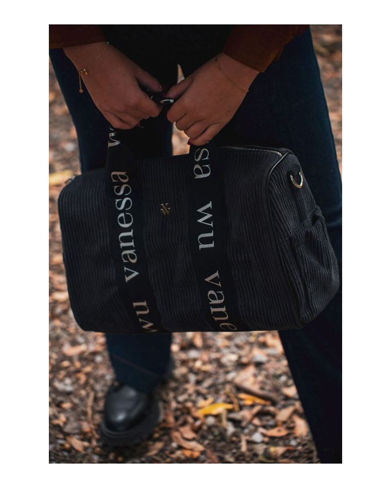 Alliant élégance et praticité, ce sac bowling en velours côtelé noir se distingue par son fond en similicuir avec pieds ronds argentés et sa fermeture éclair assortie. Il offre un grand compartiment intérieur avec deux poches ouvertes et une poche zippée, ainsi que deux poches extérieures sur les côtés pour un accès rapide à vos essentiels. Ses anses débordantes en tissu noir clair à logo argenté permettent un porté main élégant, tandis que la bandoulière amovible et réglable en similicuir noir, rehaussée de boucles et mousquetons argentés, assure un porté épaule ou croisé selon vos envies. Un sac raffiné et fonctionnel, pensé pour accompagner vos journées avec style.