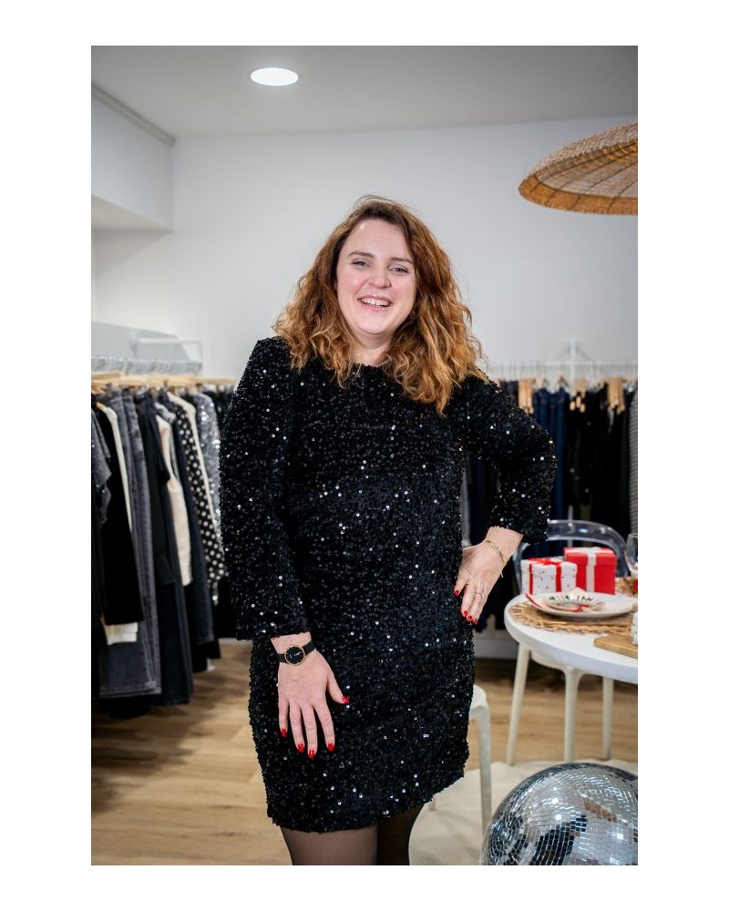 Robe noire à sequins avec un col V dans le dos élégant et un nœud délicat pour une touche féminine et raffinée. Sa coupe flatteuse sublime la silhouette tout en offrant confort et style. Parfaite pour les soirées et occasions spéciales, elle allie glamour, sophistication et allure irrésistible.