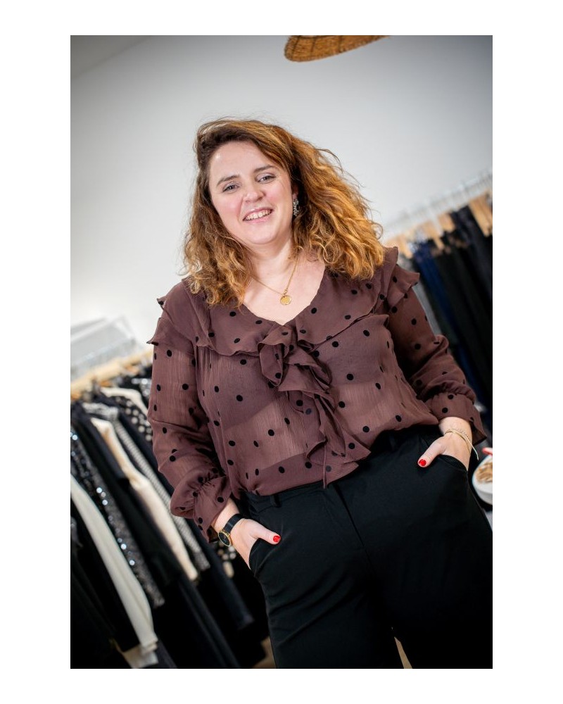 Blouse marron à volants, décorée de pois noirs pour un look féminin et élégant. Sa coupe fluide sublime la silhouette tout en offrant confort et liberté de mouvement. Parfaite pour le quotidien ou les occasions plus chics, elle apporte style, légèreté et raffinement à vos tenues.