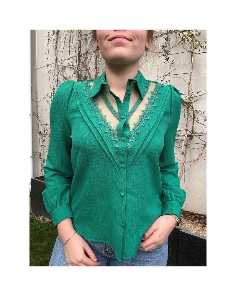 Chemise verte légère et fluide, au tombé délicat. Son décolleté est sublimé par un empiècement en dentelle fine et un tulle brodé de petits pois, créant un jeu de transparence élégant. Manches longues légèrement bouffantes et fermeture boutonnée ton sur ton pour une allure féminine, fraîche et sophistiquée.