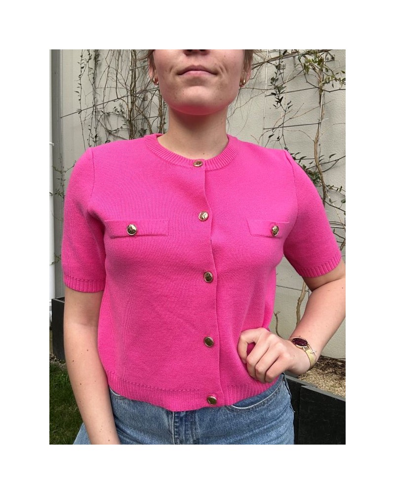 Découvrez notre pull manches courtes au charme délicat, confectionné dans un rose doux et élégant. Ses boutons dorés apportent une touche sophistiquée et lumineuse, faisant de ce modèle un essentiel chic et polyvalent pour toutes les occasions. La coupe légère et confortable assure une allure féminine tout en restant facile à porter, que ce soit avec un jean casual ou une jupe élégante.