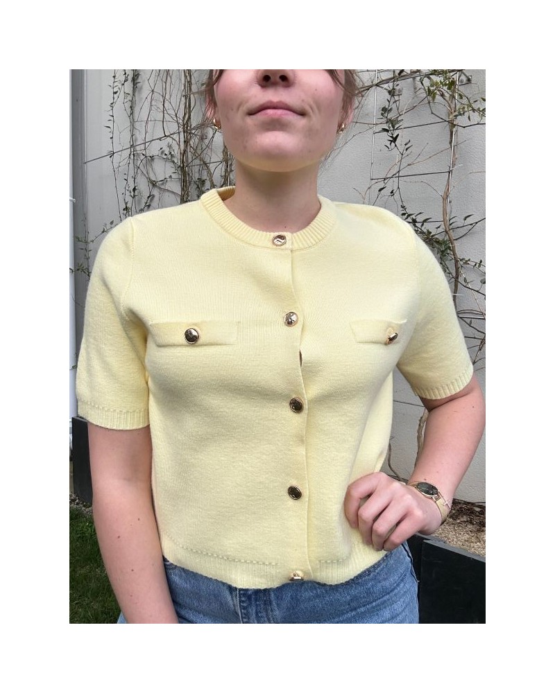 Adoptez l’élégance lumineuse avec notre pull manches courtes en jaune éclatant. Les boutons dorés ajoutent une touche raffinée et chic, tandis que la coupe légère et confortable garantit un style à la fois féminin et facile à porter. Parfait avec un jean casual ou une jupe élégante, ce modèle apporte une note de gaieté à toutes vos tenues.