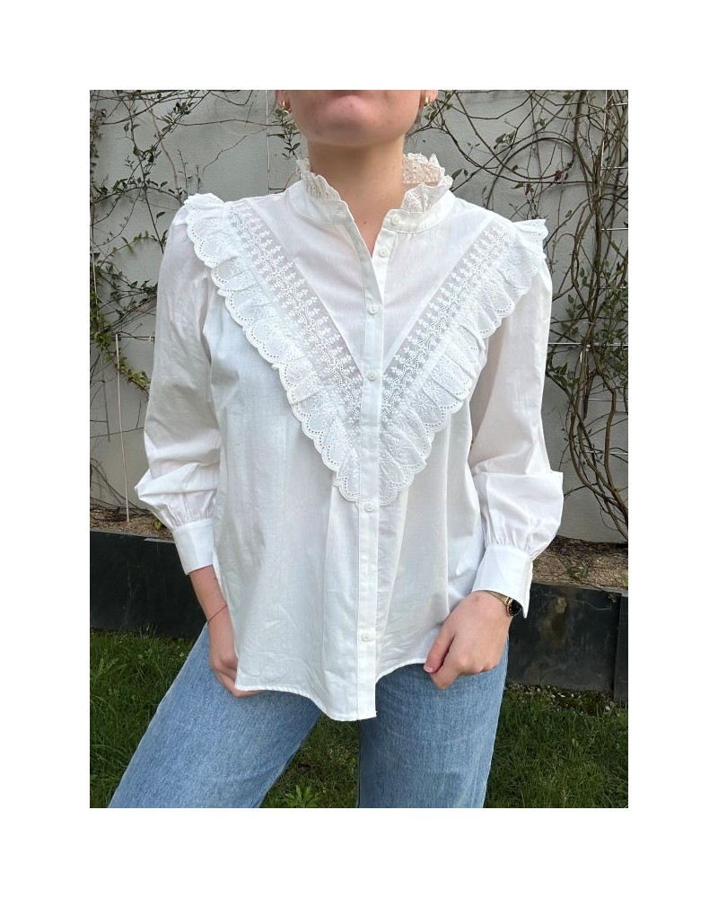 Cette blouse est de couleur blanche, avec un style romantique et délicat. Elle possède un col montant légèrement volanté et une fermeture boutonnée sur le devant. Le détail principal est le grand empiècement en forme de V sur la poitrine, décoré de dentelle et de volants ajourés qui apportent une touche élégante et féminine. Les manches sont longues, légèrement bouffantes, et se terminent par des poignets boutonnés. Le tissu semble léger, donnant à la blouse un aspect à la fois chic, raffiné et confortable
