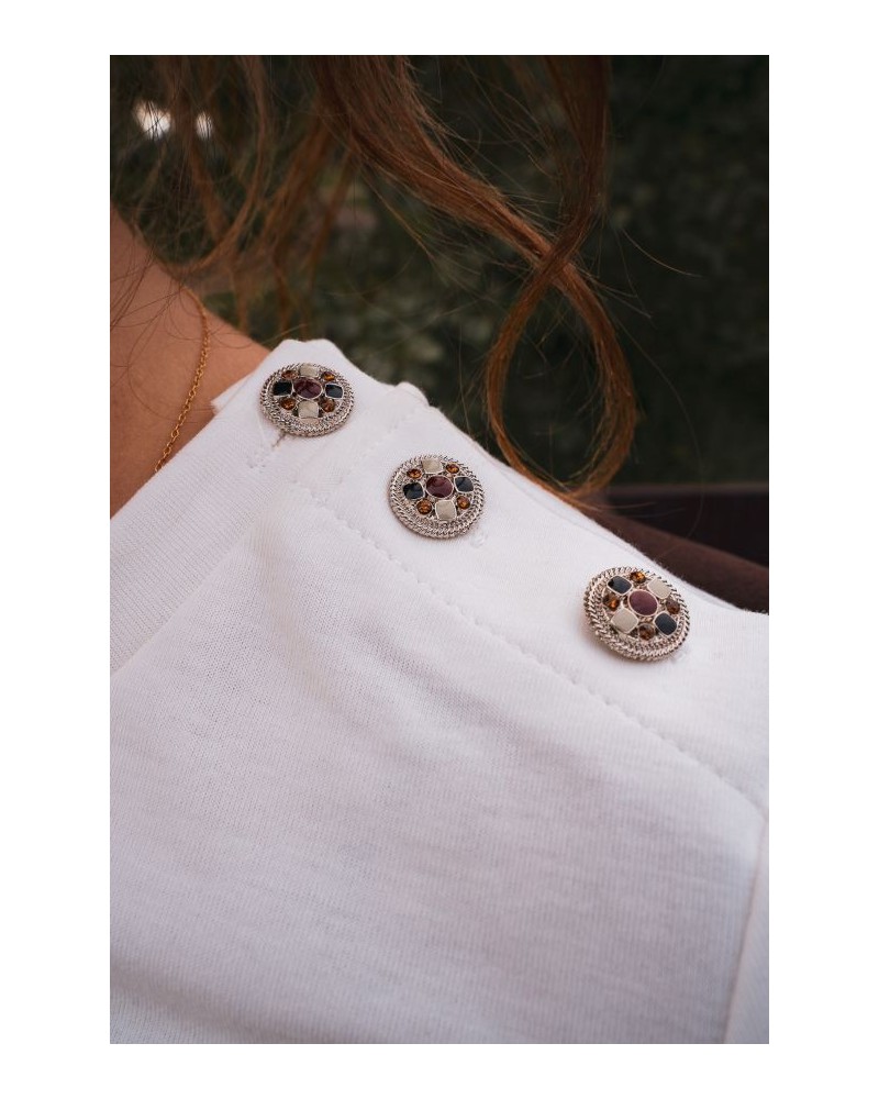 Craquez pour l’élégance discrète de ce t-shirt blanc à manches courtes, rehaussé de trois boutons sur l’épaule gauche. Confortable et raffiné, il se distingue par ses détails soignés et sa coupe moderne. Une pièce essentielle qui allie simplicité et style au quotidien.