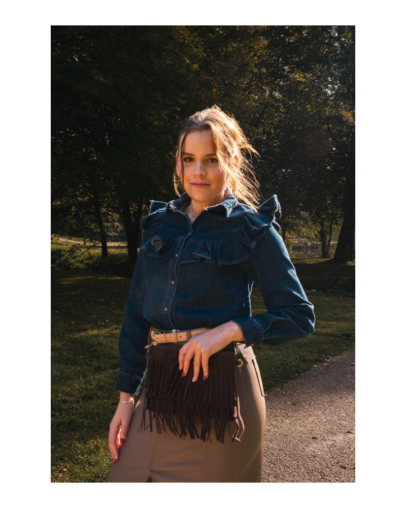 Alliez féminité et allure denim avec cette chemise en jean brut à volants. Sa coupe structurée et ses détails délicats apportent une touche élégante à un classique du vestiaire. Confortable et tendance, elle se porte aussi bien seule que superposée pour un look moderne et affirmé.