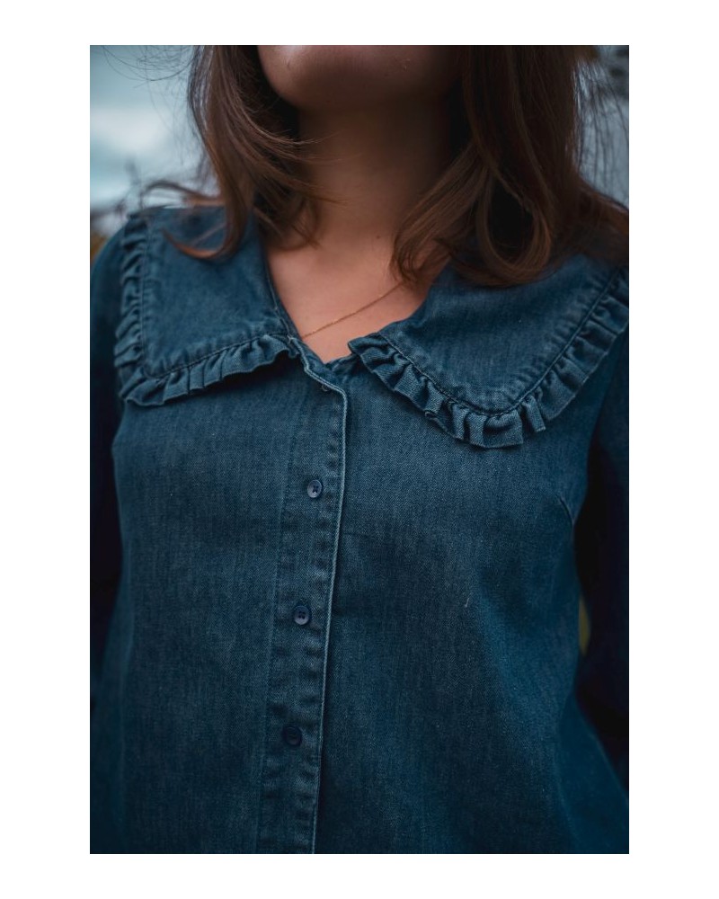 Indémodable et pleine de caractère, cette chemise en jean séduit par son grand col et sa coupe décontractée.