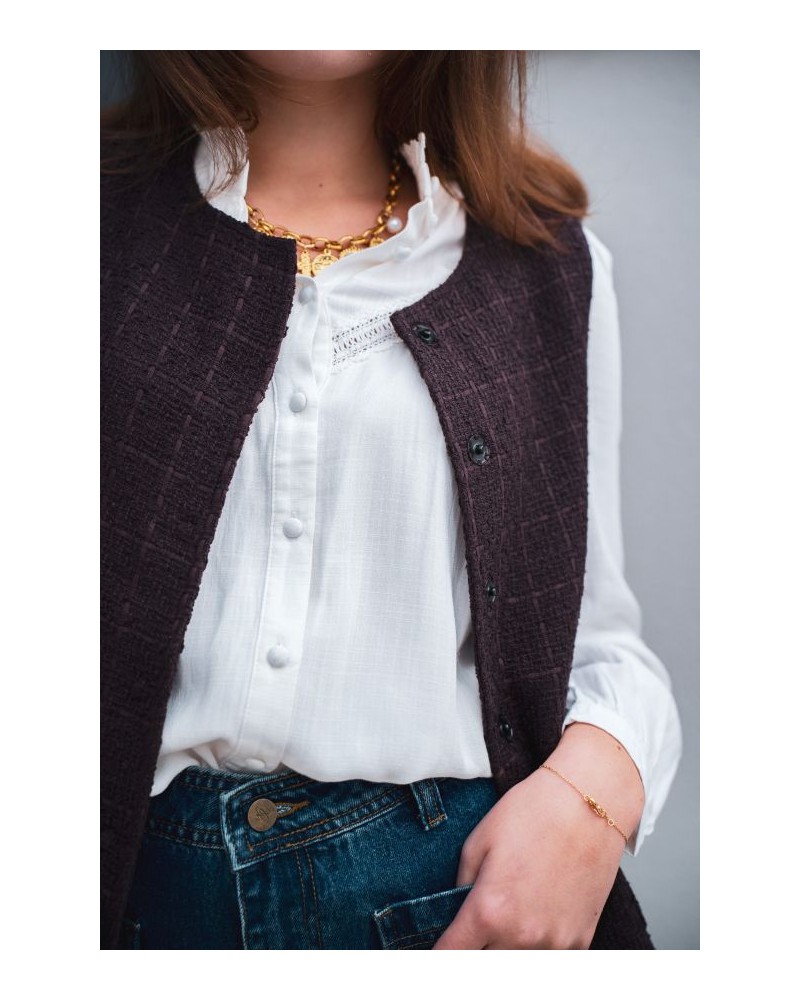 Féminine et raffinée, cette blouse blanche séduit par ses finitions délicates et ses broderies discrètes près du col.