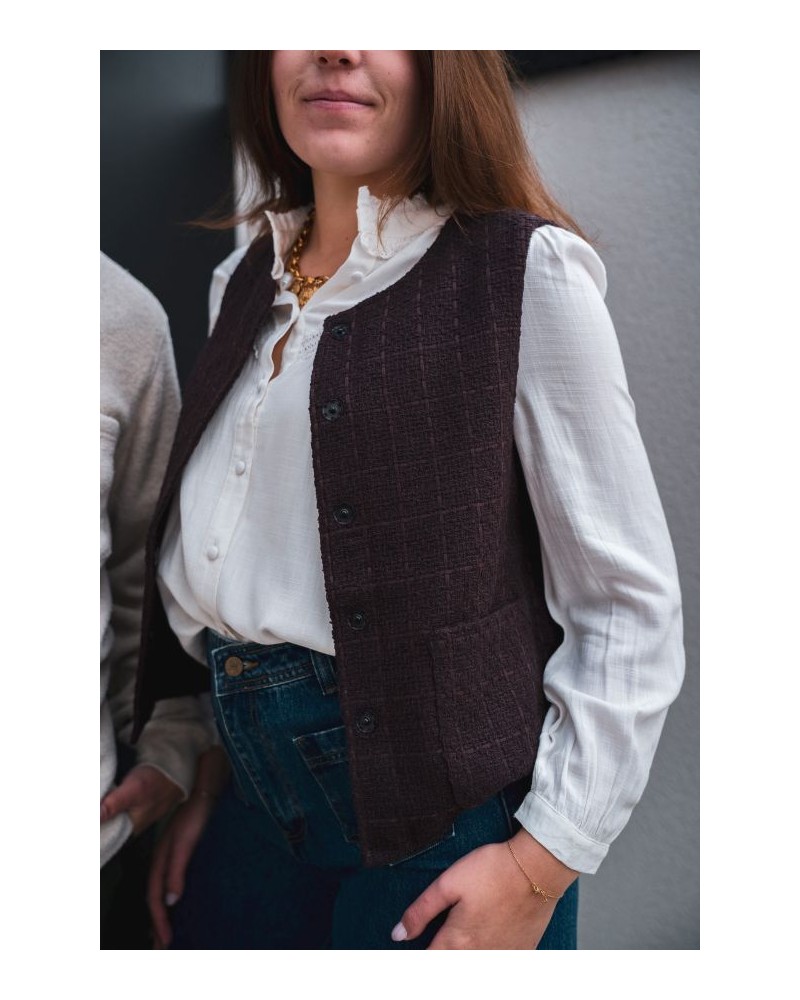 Chic et intemporel, ce gilet sans manches en tweed séduit par sa matière texturée et sa couleur chocolat profonde.
