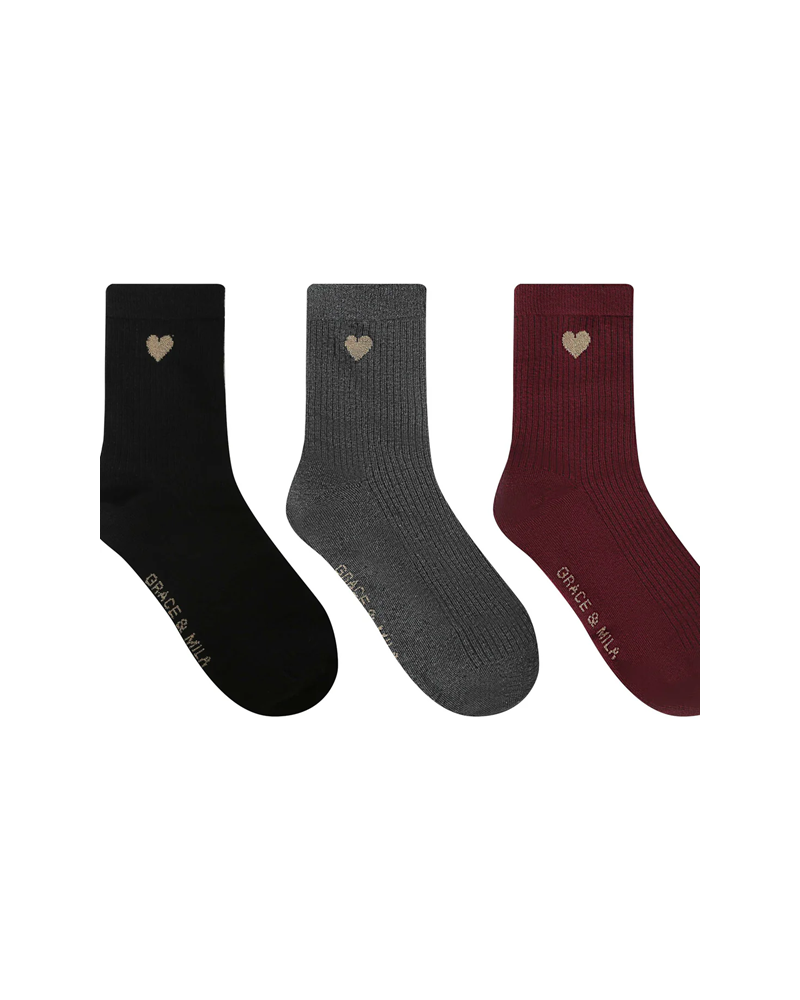 Les chaussettes mi-hautes SHELBY sont confectionnées dans une maille côtelée et sont agrémentées d'un cœur en lurex doré. Les chaussettes en maille SHELBY sont soigneusement emballées dans une boîte élégante et minimaliste. Celles-ci viennent compléter la collection d'accessoires Grace & Mila.