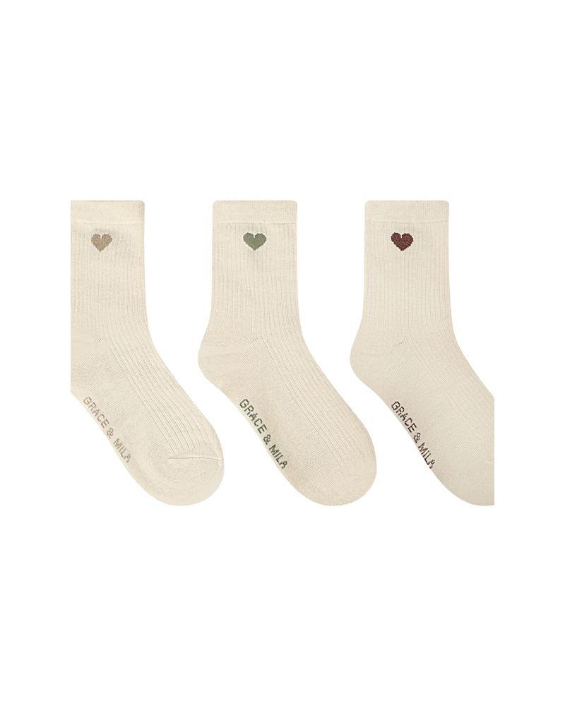 Les chaussettes mi-hautes SATINE sont confectionnées dans une maille côtelée écru et sont agrémentées d'un cœur coloré en lurex. Les chaussettes en maille SATINE sont soigneusement emballées dans une boîte élégante et minimaliste. Celles-ci viennent compléter la collection d'accessoires Grace & Mila.